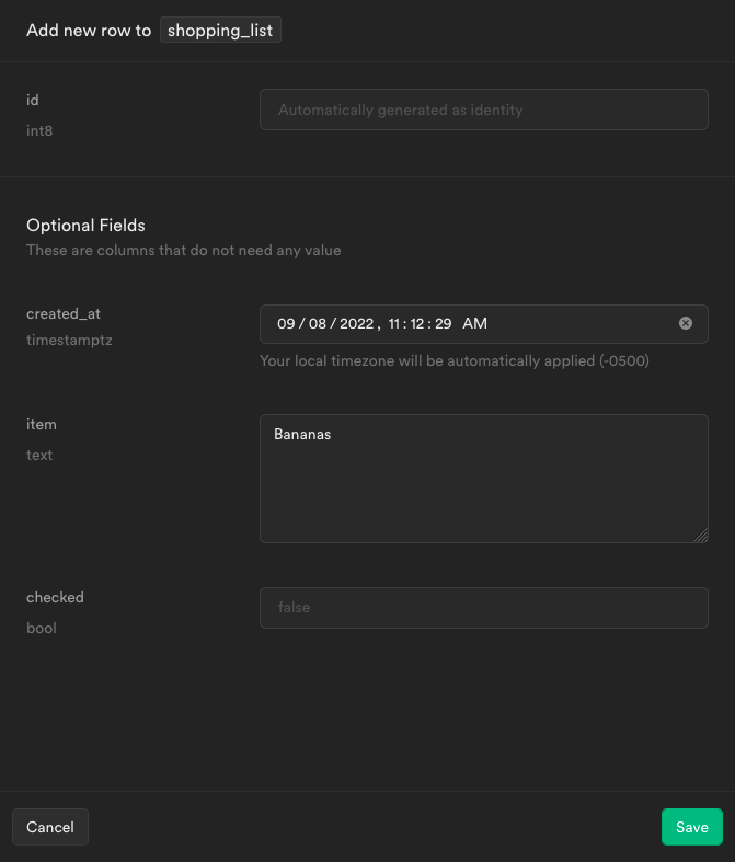 shopping_list, and the table has anitemcolumn withtextcontent and acheckedcolumn withboolcontent. Thecheckedcolumn also has a default value offalse. This is in addition to the default columns,idandcreated_at.You should now be on the page for the table, and can input new rows of data using the + Insert row button.