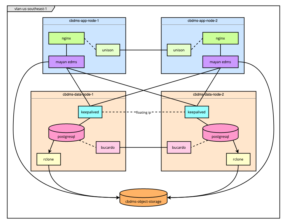 rclonedelivers PostgreSQL database backups.The Terraform script deploys two nodes for running the PostgreSQL databases, which act as the backends for the Mayan EDMS application. Terraform creates the nodes and subsequently delivers the configuration and script files to be used in setting up the nodes.